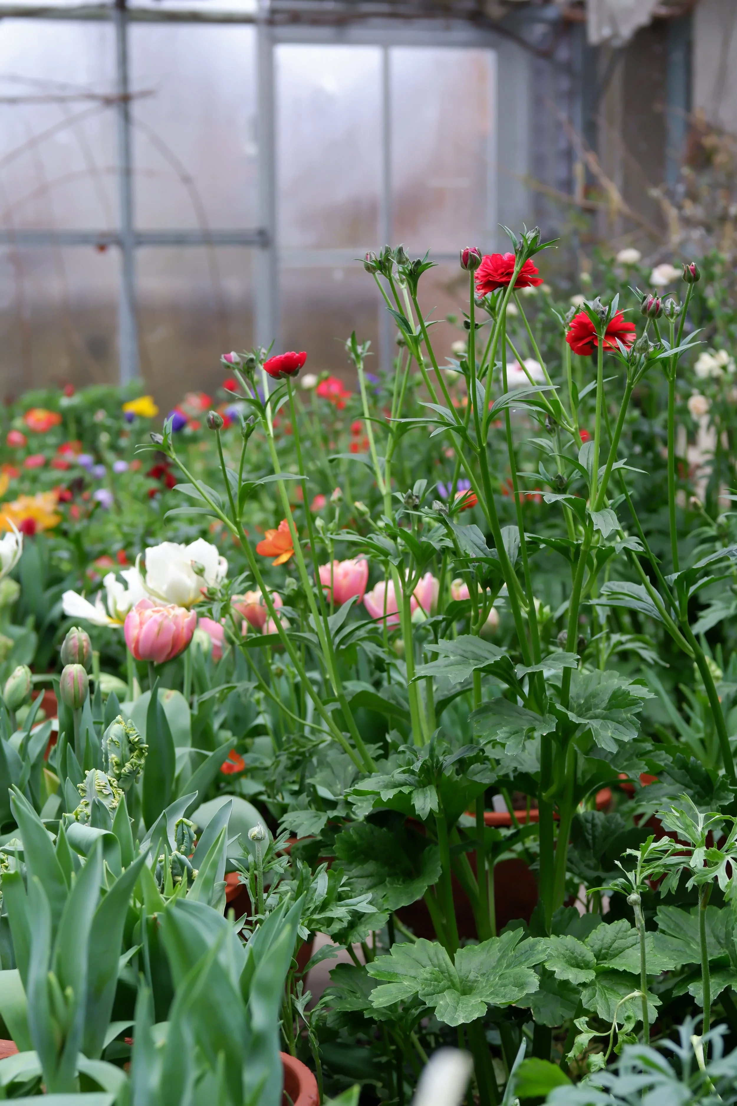 …And what a sight for sore eyes! After the wettest March for 40 years it takes a moment to adjust to all the colour and the fragrance. And in a sudden rush of awareness I realise how deeply I long for the garden to be full of life again. The grey skies outside amplify the colours. Primroses, anemones, jasmine, butterfly ranunculus, tulips, violets, scented geranium, paperwhites it’s a delicious cacophony. I eat a piece of blood orange polenta cake which seems to perfectly complement and complete the olfactory greenhouse experience.